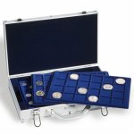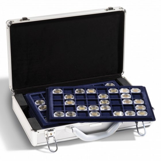 Βαλιτσάκι νομισμάτων για 240 νομίσματα των 2 ευρώ (μέσα σε κάψουλες) ή για νομίσατα μέχρι 33mm. Περιέχει 6 ταμπλό και 2 κλειδιά.