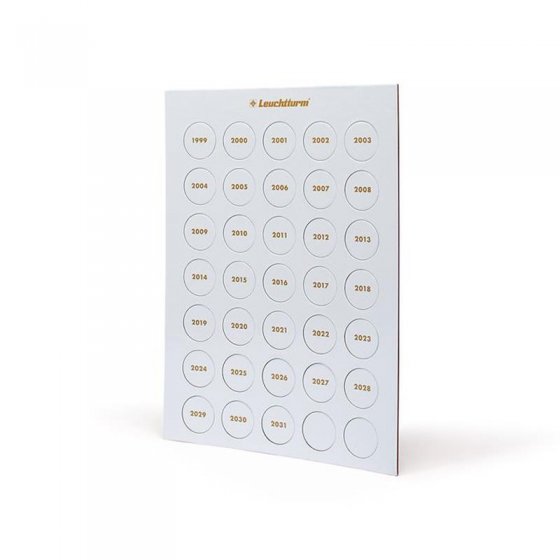 Year-date chips made of carton for identifying and arranging 2-euro coin collections.