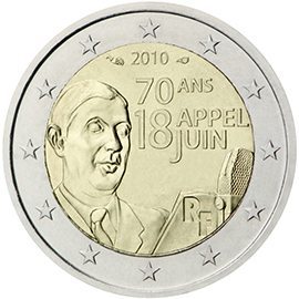 Θέμα: 70ή επέτειος της Έκκλησης της 18ης Ιουνίου Ποσότητα: 20 εκατομμύρια κέρματα Περιγραφή: Το κέρμα εκδίδεται με την ευκαιρία της 70ής επετείου της ραδιοφωνικής έκκλησης («Appel du 18 juin») που απηύθυνε ο Σαρλ ντε Γκωλ –ως επικεφαλής των Ελεύθερων Γαλλικών Δυνάμεων– από το BBC στο Λονδίνο στις 18 Ιουνίου 1940, μετά την παράδοση της Γαλλίας. Απευθυνόμενος στο γαλλικό λαό, ο ντε Γκωλ δήλωσε ότι ο πόλεμος δεν είχε τελειώσει. Αυτή η ομιλία θεωρείται ότι σηματοδότησε τη γέννηση της Γαλλικής Αντίστασης και την έναρξη του αγώνα κατά της γερμανικής κατοχής στη διάρκεια του Β' Παγκοσμίου Πολέμου. Στην περίμετρο του κέρματος απεικονίζονται τα 12 αστέρια της Ευρωπαϊκής Ένωσης. Ημερομηνία έκδοσης: Ιούνιος 2010