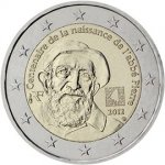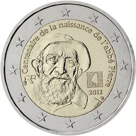 Θέμα: 100 χρόνια από γέννηση του Αβά Πιερ, φημισμένου στη Γαλλία ως προστάτη των φτωχών Ποσότητα: 1 εκατομμύριο κέρματα Περιγραφή: Στο κέρμα και ελαφρώς προς τα αριστερά σε σχέση με το κέντρο του κέρματος απεικονίζεται προσωπογραφία του Αβά Πιερ με τον περίφημο μπερέ του, ενώ στα δεξιά απεικονίζεται ο λογότυπος του ιδρύματος που φέρει το όνομά του, καθώς και σειρά μικρογραμμάτων που σχηματίζουν την ερώτηση «Et les autres?», αγαπημένο του απόφθεγμα για να υπενθυμίζει ότι δεν πρέπει να ξεχνάμε να βοηθάμε τους άλλους. Γύρω από την προσωπογραφία και κατά μήκος της εσωτερικής περιμέτρου του κέρματος αναπτύσσεται σε τοξοειδή διάταξη η επιγραφή «Centenaire de la naissance de l’abbé Pierre», στο αριστερό άκρο της οποίας είναι χαραγμένα το κέρας της αφθονίας (σήμα του νομισματοκοπείου «Monnaie de Paris») και τα γράμματα «RF» που υποδηλώνουν τη χώρα έκδοσης, στο δε δεξιό της άκρο το «λουλουδάκι» (η σφραγίδα του εργαστηρίου χαρακτικής). Στην περίμετρο του κέρματος απεικονίζονται τα δώδεκα αστέρια της Ευρωπαϊκής Ένωσης. Ημερομηνία έκδοσης: Ιούλιος 2012