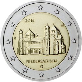 Θέμα: Niedersachsen - σειρά αφιερωμένη στα ομόσπονδα κρατίδια Ποσότητα: 30 εκατομμύρια κέρματα Περιγραφή: Στο κέρμα απεικονίζεται η Εκκλησία του Αγίου Μιχαήλ στο Hildesheim, στην Κάτω Σαξονία, η οποία αποτελεί μνημείο Παγκόσμιας Πολιτιστικής Κληρονομιάς της Ουνέσκο από το 1985. Στο επάνω μέρος αναγράφεται το έτος έκδοσης «2014» και στα αριστερά το σήμα του νομισματοκοπείου («A», «D», «F», «G» ή «J»). Στο κάτω μέρος αναγράφεται η επιγραφή «NIEDERSACHSEN» και κάτω από αυτή το γράμμα της χώρας έκδοσης «D». Στο επάνω δεξιά μέρος εμφανίζονται τα αρχικά του χαράκτη «OE» (Ott Erich). Στην περίμετρο του κέρματος απεικονίζονται τα δώδεκα αστέρια της Ευρωπαϊκής Ένωσης. Ημερομηνία έκδοσης: Ιανουάριος 2014