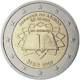 Θέμα: 50ή επέτειος της Συνθήκης της Ρώμης Περιγραφή: Στο κέρμα απεικονίζεται το κείμενο της Συνθήκης υπογεγραμμένο από τις έξι ιδρυτικές χώρες και στο βάθος αναπαρίσταται η πλακόστρωση (η οποία σχεδιάστηκε από τον Μιχαήλ Άγγελο) της Piazza del Campidoglio στη Ρώμη, όπου υπογράφηκε η Συνθήκη στις 25 Μαρτίου 1957. Οι επιγραφές «ΣΥΝΘΗΚΗ ΤΗΣ ΡΩΜΗΣ 50 ΧΡΟΝΙΑ», «ΕΥΡΩΠΗ» και το όνομα της χώρας έκδοσης εμφανίζονται στις αντίστοιχες γλώσσες της ζώνης του ευρώ ή στα λατινικά. Παρόλο που η επιγραφή διαφέρει από χώρα σε χώρα, το σχέδιο παραμένει το ίδιο. Με τη Συνθήκη της Ρώμης ιδρύθηκε η Ευρωπαϊκή Οικονομική Κοινότητα και ξεκίνησε μια πορεία που οδήγησε τελικά στην εισαγωγή του ευρώ το 1999 και των τραπεζογραμματίων και κερμάτων ευρώ το 2002. Με την ευκαιρία του εορτασμού της επετείου στις 25 Μαρτίου 2007 οι χώρες της ζώνης του ευρώ αποφάσισαν να εκδώσουν από κοινού αυτό το αναμνηστικό κέρμα. Το σχέδιό του επιλέχθηκε μετά από διαγωνισμό που διοργάνωσαν τα ευρωπαϊκά νομισματοκοπεία. Στην περίμετρο του κέρματος απεικονίζονται τα 12 αστέρια της Ευρωπαϊκής Ένωσης. Ημερομηνία έκδοσης: Μάρτιος 2007