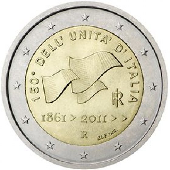 Θέμα: 150ή επέτειος της ιταλικής ενοποίησης Ποσότητα: 10 εκατομμύρια κέρματα Περιγραφή: Στο κέρμα απεικονίζονται στο κέντρο τρεις ανεμίζουσες ιταλικές σημαίες οι οποίες αντιπροσωπεύουν τις τρεις τελευταίες 50ετείς περιόδους –που έληξαν το 1911, το 1961 και το 2011 αντίστοιχα– και υποδηλώνουν μια τέλεια σχέση μεταξύ των γενεών: αυτός είναι ο λογότυπος της 150ής επετείου της ιταλικής ενοποίησης. Τις τρεις σημαίες περιβάλλει ημικυκλικά η επιγραφή «150° DELL’UNITÀ D’ITALIA» (150ή επέτειος της ιταλικής ενοποίησης), ενώ στα δεξιά τους αναγράφονται ο ένας επάνω στον άλλο οι χαρακτήρες «RΙ» οι οποίοι υποδηλώνουν τη χώρα έκδοσης (Δημοκρατία της Ιταλίας). Κάτω από τις τρεις σημαίες αναγράφονται τα έτη «1861 › 2011 › › ». Κάτω από τα έτη, στο κέντρο, αναγράφεται το σήμα του νομισματοκοπείου «R» και, στα δεξιά, οι χαρακτήρες «ΕLF INC» που είναι τα αρχικά του καλλιτέχνη Ettore Lorenzo Frapiccini και τα πρώτα τρία γράμματα της ιταλικής ονομασίας του επαγγέλματός του (incisore). Στην περίμετρο του κέρματος απεικονίζονται τα δώδεκα αστέρια της Ευρωπαϊκής Ένωσης. Ημερομηνία έκδοσης: Μάρτιος 2011