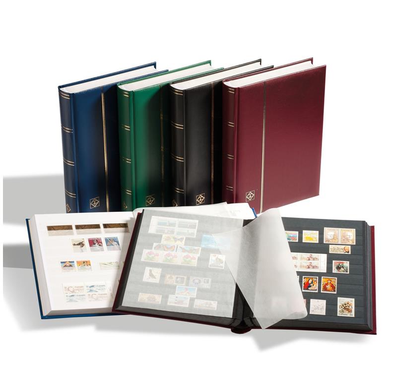 COMFORT A4 stockbook with 64 black pages, padded leatherette cover. The book features 9 clear glassine strips per page, double interleaves with double hinge binding.