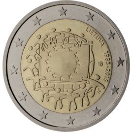 Θέμα: 30ή επέτειος της σημαίας της ΕΕ Περιγραφή: Στο κέρμα απεικονίζεται η σημαία της ΕΕ ως το σύμβολο που ενώνει ανθρώπους και πολιτισμούς με κοινά οράματα και ιδανικά για ένα καλύτερο κοινό μέλλον. Δώδεκα αστέρια που μετατρέπονται σε ανθρώπινες φιγούρες περιβάλλουν τη γέννηση μιας νέας Ευρώπης. Στο επάνω δεξιό μέρος, σε ημικύκλιο, αναγράφεται η χώρα έκδοσης και οι χρονολογίες «1985-2015». Στο κάτω δεξιό μέρος αναγράφονται τα αρχικά του καλλιτέχνη (Γεωργίου Σταματόπουλου). Στην περίμετρο του κέρματος απεικονίζονται τα δώδεκα αστέρια της Ευρωπαϊκής Ένωσης. Ημερομηνία έκδοσης: 4ο τρίμηνο 2015