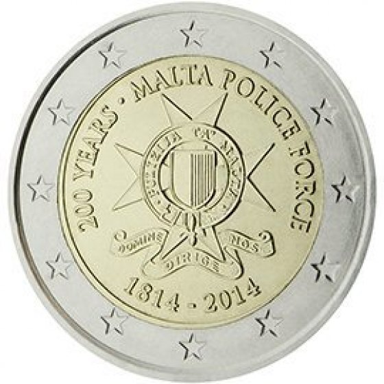 Θέμα: 200 χρόνια από την ίδρυση της Αστυνομίας της Μάλτας Ποσότητα: 300.000 κέρματα Περιγραφή: Το κέρμα είναι αφιερωμένο στα 200 χρόνια από την ίδρυση της Αστυνομίας της Μάλτας με τη διακήρυξη XXII του 1814. Η Αστυνομία της Μάλτας είναι, συνεπώς, από τις αρχαιότερες στην Ευρώπη. Στο κέρμα απεικονίζεται το έμβλημα της Αστυνομίας της Μάλτας με την επιγραφή «200 Years Malta Police Force» και τα έτη «1814-2014». Στην περίμετρο του κέρματος απεικονίζονται τα δώδεκα αστέρια της Ευρωπαϊκής Ένωσης. Ημερομηνία έκδοσης: Ιούλιος 2014
