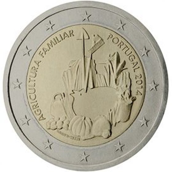 Θέμα: Το Διεθνές Έτος Οικογενειακής Γεωργίας Ποσότητα: 500.000 κέρματα Περιγραφή: Στο κέντρο του σχεδίου απεικονίζονται εργαλεία που χρησιμοποιούνται κατά κανόνα στην παραδοσιακή γεωργία, καθώς και γεωργικά προϊόντα: ένα κοτόπουλο το οποίο περιβάλλεται από κολοκύθες, ένα καλάθι πατάτες και άλλα λαχανικά και άνθη. Σε ημικυκλική διάταξη, διακρίνεται στα αριστερά το αναμνηστικό θέμα «AGRICULTURA FAMILIAR» (οικογενειακή γεωργία) και στα δεξιά το όνομα της χώρας έκδοσης «PORTUGAL» και το έτος έκδοσης «2014». Κάτω αριστερά εμφανίζεται το σήμα του νομισματοκοπείου «INCM». Στην περίμετρο του κέρματος απεικονίζονται τα δώδεκα αστέρια της Ευρωπαϊκής Ένωσης. Ημερομηνία έκδοσης: Οκτώβριος 2014