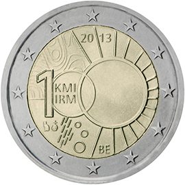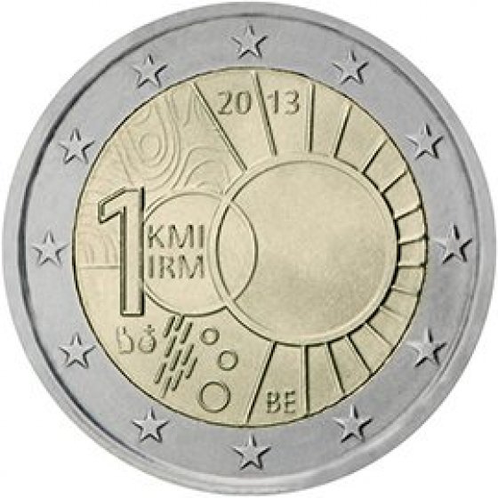 Θέμα: 100 χρόνια από την ίδρυση του Βασιλικού Μετεωρολογικού Ινστιτούτου (Koninklijk Meteorologisch Instituut/Institut Royal Météorologique) Ποσότητα: 2 εκατομμύρια κέρματα Περιγραφή: Στο κέρμα απεικονίζεται ο αριθμός 100, του οποίου το πρώτο μηδενικό περικλείει τις συντομογραφίες «KMI» και «IRM» και το δεύτερο μηδενικό αναπαριστά έναν ήλιο. Στα αριστερά του ήλιου διακρίνονται ισοβαρείς καμπύλες, σταγόνες βροχής και νιφάδες χιονιού. Στις επάνω ακτίνες του ηλίου αναγράφεται το έτος «2013» και στις κάτω ακτίνες ο κωδικός της χώρας «BE». Τα διακριτικά του διευθυντή του νομισματοκοπείου και το σήμα του νομισματοκοπείου των Βρυξελλών (μια κρανοφόρος κεφαλή του αρχάγγελου Μιχαήλ) διακρίνονται κάτω από το στοιχείο 1 του αριθμού 100. Στην περίμετρο του κέρματος απεικονίζονται τα δώδεκα αστέρια της Ευρωπαϊκής Ένωσης. Ημερομηνία έκδοσης: Σεπτέμβριος 2013