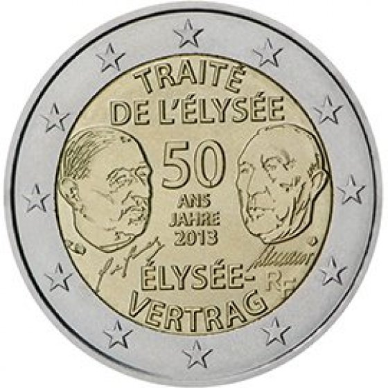 Θέμα: 50ή επέτειος της υπογραφής της συνθήκης των Ηλυσίων Ποσότητα: 10 εκατομμύρια κέρματα Περιγραφή: Στο κέρμα, το οποίο σχεδιάστηκε από τον Yves Sampo του Νομισματοκοπείου των Παρισίων, τη Stefanie Lindner του Κρατικού Νομισματοκοπείου του Βερολίνου, την Alina Hoyer (Βερολίνο) και τη Sneschana Russewa-Hoyer (Βερολίνο), απεικονίζονται σχηματοποιημένα πορτρέτα των προσωπικοτήτων που υπέγραψαν τη Συνθήκη των Ηλυσίων (του τότε καγκελάριου της Ομοσπονδιακής Δημοκρατίας της Γερμανίας Konrad Adenauer και του πρώην προέδρου της Γαλλικής Δημοκρατίας Charles de Gaulle), οι υπογραφές τους και οι λέξεις «50 ANS JAHRE» με το έτος «2013» στο κέντρο. Στο κέρμα αναγράφονται οι λέξεις «TRAITÉ DE L’ÉLYSÉE» στο άνω άκρο και οι λέξεις «ÉLYSÉE-VERTRAG» στο κάτω άκρο. Στα δεξιά, κάτω από το πορτρέτο του Adenauer, απεικονίζεται η σφραγίδα του εργαστηρίου χαρακτικής («fleurette») καθώς και ο κωδικός «RF» της χώρας έκδοσης, ενώ στα αριστερά, κάτω από το πορτρέτο του de Gaulle, εμφανίζεται το διακριτικό σήμα του νομισματοκοπείου. Στην περίμετρο του κέρματος απεικονίζονται τα δώδεκα αστέρια της Ευρωπαϊκής Ένωσης. Ημερομηνία έκδοσης: Ιανουάριος 2013