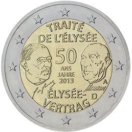 Θέμα: 50ή επέτειος της υπογραφής της συνθήκης των Ηλυσίων Ποσότητα: 11 εκατομμύρια κέρματα Περιγραφή: Στο κέρμα, το οποίο σχεδιάστηκε από τον Yves Sampo του Νομισματοκοπείου των Παρισίων, τη Stefanie Lindner του Κρατικού Νομισματοκοπείου του Βερολίνου, την Alina Hoyer (Βερολίνο) και τη Sneschana Russewa-Hoyer (Βερολίνο), απεικονίζονται σχηματοποιημένα πορτρέτα των προσωπικοτήτων που υπέγραψαν τη Συνθήκη των Ηλυσίων (του τότε καγκελάριου της Ομοσπονδιακής Δημοκρατίας της Γερμανίας Konrad Adenauer και του πρώην προέδρου της Γαλλικής Δημοκρατίας Charles de Gaulle), οι υπογραφές τους και οι λέξεις «50 ANS JAHRE» με το έτος «2013» στο κέντρο. Στο κέρμα αναγράφονται οι λέξεις «TRAITÉ DE L’ÉLYSÉE» στο άνω άκρο και οι λέξεις «ÉLYSÉE-VERTRAG» στο κάτω άκρο. Στα δεξιά, κάτω από το πορτρέτο του Adenauer, εμφανίζεται το σήμα του νομισματοκοπείου («A», «D», «F», «G» ή «J», κατά περίπτωση), καθώς και το γράμμα «D» που δηλώνει τη χώρα έκδοσης. Στην περίμετρο του κέρματος απεικονίζονται τα δώδεκα αστέρια της Ευρωπαϊκής Ένωσης. Ημερομηνία έκδοσης: Ιανουάριος 2013