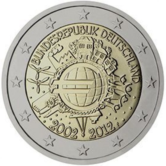 Θέμα: 10η επέτειος των τραπεζογραμματίων και των κερμάτων ευρώ Περιγραφή: Στο κέρμα, το οποίο φιλοτέχνησε ο Helmut Andexlinger από το αυστριακό νομισματοκοπείο και επέλεξαν οι πολίτες και οι κάτοικοι της ζώνης του ευρώ ως κοινό αναμνηστικό κέρμα για το 2012, απεικονίζεται στο κέντρο η υφήλιος με τη μορφή του συμβόλου του ευρώ, προβάλλοντας το γεγονός ότι το ευρώ έχει εξελιχθεί σε νόμισμα πραγματικά παγκόσμιας εμβέλειας τα τελευταία δέκα έτη. Τα στοιχεία που περιβάλλουν το σχέδιο συμβολίζουν τη σημασία του ευρώ για τους απλούς ανθρώπους (οι οποίοι εκπροσωπούνται από τα μέλη μιας οικογένειας), για τον κόσμο των χρηματοπιστωτικών συναλλαγών (εικόνα του Eurotower), για το εμπόριο (ένα πλοίο), για τη βιομηχανία (ένα εργοστάσιο) και για τον τομέα της ενέργειας και της έρευνας και ανάπτυξης (δύο ανεμογεννήτριες). Τα αρχικά του σχεδιαστή «Α.Η.» διακρίνονται (αν κοιτάξει κανείς πολύ προσεκτικά) ανάμεσα στο πλοίο και το Eurotower. Στο επάνω και στο κάτω άκρο του κέρματος αναγράφονται η χώρα έκδοσης και τα έτη «2002 - 2012» αντίστοιχα. Το κέρμα αυτό θα εκδοθεί από όλες τις χώρες της ζώνης του ευρώ. Στην περίμετρο του κέρματος απεικονίζονται τα δώδεκα αστέρια της Ευρωπαϊκής Ένωσης. Ημερομηνία έκδοσης: Ιανουάριος 2012