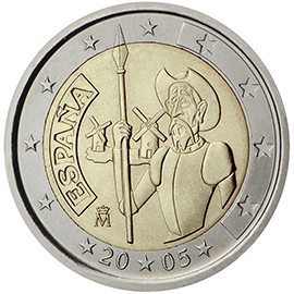 Θέμα: 400 χρόνια από την πρώτη έκδοση του βιβλίου του Μιγκέλ ντε Θερβάντες «Δον Κιχώτης» Ποσότητα: 8 εκατομμύρια κέρματα Περιγραφή: Στο κέρμα απεικονίζεται ο δον Κιχώτης να κρατά ένα κοντάρι, με φόντο ανεμόμυλους. Στα αριστερά, έχει χαραχθεί έγγλυφα η λέξη «ESPAÑA», ενώ κάτω από αυτή εμφανίζεται το σύμβολο του νομισματοκοπείου «M». Στην περίμετρο του κέρματος απεικονίζονται τα 12 αστέρια της Ευρωπαϊκής Ένωσης, τέσσερα από τα οποία έχουν χαραχθεί έγγλυφα. Στο κάτω μέρος αναγράφεται το έτος έκδοσης. Ημερομηνία έκδοσης: Απρίλιος 2005