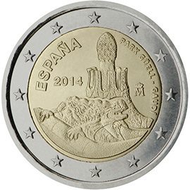 Θέμα: Μνημεία παγκόσμιας πολιτιστικής και φυσικής κληρονομιάς της UNESCO - Πάρκο Güell Ποσότητα: 8 εκατομμύρια κέρματα Περιγραφή: Στο κέρμα απεικονίζεται σε πρώτο πλάνο ένα γλυπτό σαύρας, που είναι το έμβλημα του πάρκου Güell και σχεδιάστηκε από τον αρχιτέκτονα Antoni Gaudí. Στο βάθος απεικονίζεται λεπτομέρεια ενός από τα περίπτερα που βρίσκονται στην είσοδο του Πάρκου Güell. Στο επάνω μέρος, σε κυκλική διάταξη και με κεφαλαία γράμματα αναγράφονται οι λέξεις «ESPAÑA» και «PARK GÜELL - GAUDÍ». Στα αριστερά διακρίνεται το έτος έκδοσης «2014» και στα δεξιά το σήμα του νομισματοκοπείου. Στην περίμετρο του κέρματος απεικονίζονται τα δώδεκα αστέρια της Ευρωπαϊκής Ένωσης. Ημερομηνία έκδοσης: Μάρτιος 2014