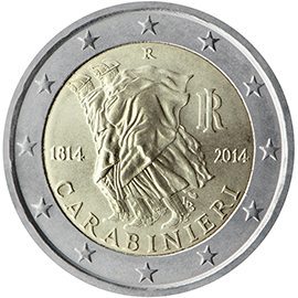 Θέμα: 200 χρόνια από την ίδρυση του Σώματος των Καραμπινιέρων (Arma dei Carabinieri).Ποσότητα: 6,5 εκατομμύρια κέρματα Περιγραφή: Στο σχέδιο απεικονίζεται μια νέα εκδοχή του γλυπτού «Pattuglia di Carabinieri nella tormenta» που φιλοτεχνήθηκε το 1973 από τον Antonio Berti. Στα δεξιά διακρίνεται το μονόγραμμα της ιταλικής δημοκρατίας «RI» (γράμματα σε επάλληλη διάταξη) και το έτος «2014» και στα αριστερά το έτος «1814». Στο επάνω μέρος διακρίνονται σε επάλληλη διάταξη τα γράμματα «R» (το μονόγραμμα του νομισματοκοπείου της Ρώμης) και στο κάτω μέρος τα αρχικά «LDS» (τα αρχικά της καλλιτέχνιδος Luciana De Simoni) και η λέξη «CARABINIERI». Στην περίμετρο του κέρματος απεικονίζονται τα δώδεκα αστέρια της Ευρωπαϊκής Ένωσης. Ημερομηνία έκδοσης: Ιούνιος 2014