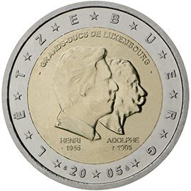 Θέμα: Πεντηκοστά γενέθλια του Μεγάλου Δούκα Ερρίκου, 5η επέτειος της ενθρόνισής του και 100ή επέτειος του θανάτου του Μεγάλου Δούκα Αδόλφου Ποσότητα: 2,8 εκατομμύρια κέρματα Περιγραφή: Στο κέρμα απεικονίζεται η μορφή του Μεγάλου Δούκα Ερρίκου να κοιτάζει προς τα δεξιά μπροστά από τη μορφή του Μεγάλου Δούκα Αδόλφου. Επάνω από τις μορφές αναγράφεται η επιγραφή «GRANDS-DUCS DE LUXEMBOURG», ενώ κάτω από αυτές έχουν χαραχθεί αντίστοιχα τα ονόματα «HENRI» με το έτος «*1955» και «ADOLPHE» με το έτος «†1905». Στην περίμετρο του κέρματος τα 12 αστέρια της ΕΕ που περιβάλλουν το σχέδιο είναι τοποθετημένα ανάμεσα στα γράμματα της λέξης «LËTZEBUERG» και στα ψηφία του έτους έκδοσης «2005». Στα αριστερά του έτους έκδοσης αναγράφεται το γράμμα «S» και στα δεξιά το σήμα του νομισματοκοπείου. Ημερομηνία έκδοσης: Ιανουάριος 2005