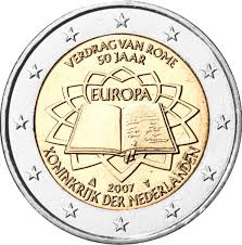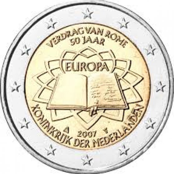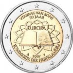 Θέμα: 50ή επέτειος της Συνθήκης της Ρώμης Περιγραφή: Στο κέρμα απεικονίζεται το κείμενο της Συνθήκης υπογεγραμμένο από τις έξι ιδρυτικές χώρες και στο βάθος αναπαρίσταται η πλακόστρωση (η οποία σχεδιάστηκε από τον Μιχαήλ Άγγελο) της Piazza del Campidoglio στη Ρώμη, όπου υπογράφηκε η Συνθήκη στις 25 Μαρτίου 1957. Οι επιγραφές «ΣΥΝΘΗΚΗ ΤΗΣ ΡΩΜΗΣ 50 ΧΡΟΝΙΑ», «ΕΥΡΩΠΗ» και το όνομα της χώρας έκδοσης εμφανίζονται στις αντίστοιχες γλώσσες της ζώνης του ευρώ ή στα λατινικά. Παρόλο που η επιγραφή διαφέρει από χώρα σε χώρα, το σχέδιο παραμένει το ίδιο. Με τη Συνθήκη της Ρώμης ιδρύθηκε η Ευρωπαϊκή Οικονομική Κοινότητα και ξεκίνησε μια πορεία που οδήγησε τελικά στην εισαγωγή του ευρώ το 1999 και των τραπεζογραμματίων και κερμάτων ευρώ το 2002. Με την ευκαιρία του εορτασμού της επετείου στις 25 Μαρτίου 2007 οι χώρες της ζώνης του ευρώ αποφάσισαν να εκδώσουν από κοινού αυτό το αναμνηστικό κέρμα. Το σχέδιό του επιλέχθηκε μετά από διαγωνισμό που διοργάνωσαν τα ευρωπαϊκά νομισματοκοπεία. Στην περίμετρο του κέρματος απεικονίζονται τα 12 αστέρια της Ευρωπαϊκής Ένωσης. Ημερομηνία έκδοσης: Μάρτιος 2007