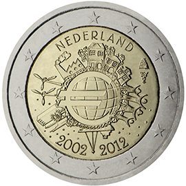 Θέμα: 10η επέτειος των τραπεζογραμματίων και των κερμάτων ευρώ Περιγραφή: Στο κέρμα, το οποίο φιλοτέχνησε ο Helmut Andexlinger από το αυστριακό νομισματοκοπείο και επέλεξαν οι πολίτες και οι κάτοικοι της ζώνης του ευρώ ως κοινό αναμνηστικό κέρμα για το 2012, απεικονίζεται στο κέντρο η υφήλιος με τη μορφή του συμβόλου του ευρώ, προβάλλοντας το γεγονός ότι το ευρώ έχει εξελιχθεί σε νόμισμα πραγματικά παγκόσμιας εμβέλειας τα τελευταία δέκα έτη. Τα στοιχεία που περιβάλλουν το σχέδιο συμβολίζουν τη σημασία του ευρώ για τους απλούς ανθρώπους (οι οποίοι εκπροσωπούνται από τα μέλη μιας οικογένειας), για τον κόσμο των χρηματοπιστωτικών συναλλαγών (εικόνα του Eurotower), για το εμπόριο (ένα πλοίο), για τη βιομηχανία (ένα εργοστάσιο) και για τον τομέα της ενέργειας και της έρευνας και ανάπτυξης (δύο ανεμογεννήτριες). Τα αρχικά του σχεδιαστή «Α.Η.» διακρίνονται (αν κοιτάξει κανείς πολύ προσεκτικά) ανάμεσα στο πλοίο και το Eurotower. Στο επάνω και στο κάτω άκρο του κέρματος αναγράφονται η χώρα έκδοσης και τα έτη «2002 - 2012» αντίστοιχα. Το κέρμα αυτό θα εκδοθεί από όλες τις χώρες της ζώνης του ευρώ. Στην περίμετρο του κέρματος απεικονίζονται τα δώδεκα αστέρια της Ευρωπαϊκής Ένωσης. Ημερομηνία έκδοσης: Ιανουάριος 2012