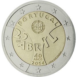Θέμα: 40ή επέτειος της επανάστασης της 25ης Απριλίου Ποσότητα: 500.000 κέρματα Περιγραφή: Οι δύο καμπύλες αναπαριστούν το γενικό σχήμα του γαρύφαλλου, του λουλουδιού που συμβολίζει το κίνημα, και από το οποίο προήλθε επίσης η ονομασία της επανάστασης. Το όνομα της χώρας έκδοσης «PORTUGAL» και ο θυρεός της χώρας είναι χαραγμένα στην κορυφή του λουλουδιού. Στο κέντρο του σχεδίου αναγράφεται η ημερομηνία του γεγονότος «25 DE ABRIL» (25η Απριλίου) και στο κάτω μέρος ο αριθμός των ετών που έχουν παρέλθει από την επανάσταση «40 ANOS» (40 έτη) και το έτος έκδοσης «2014». Το σχήμα των γραμμάτων και των αριθμών εμπνέεται από εκείνα που χρησιμοποιούνταν πριν από 40 χρόνια σε αφίσες και άλλα μέσα πολιτικής πληροφόρησης, ως σύμβολο της περιόδου ευφορίας που βίωσε η χώρα αμέσως μετά το γεγονός. Στην περίμετρο του κέρματος απεικονίζονται τα δώδεκα αστέρια της Ευρωπαϊκής Ένωσης. Ημερομηνία έκδοσης: Απρίλιος 2014
