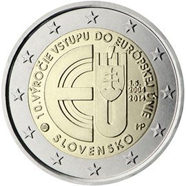 Θέμα:10η επέτειος από την ένταξη της Σλοβακικής Δημοκρατίας στην Ευρωπαϊκή Ένωση. Ποσότητα: 1 εκατομμύριο κέρματα Περιγραφή: Στο κέρμα απεικονίζονται τα σχηματοποιημένα γράμματα «EÚ», ως συντομογραφία της Ευρωπαϊκής Ένωσης, μαζί με τον θυρεό της Σλοβακικής Δημοκρατίας ενσωματωμένο σε πρώτο πλάνο. Στα δεξιά, αναγράφεται σε δυο γραμμές η ημερομηνία προσχώρησης της Σλοβακικής Δημοκρατίας στην Ευρωπαϊκή Ένωση «1.5.2004» και ακριβώς από κάτω το έτος «2014». Στο κάτω μέρος αναγράφεται η χώρα έκδοσης «SLOVENSKO» και στο επάνω μέρος, σε ημικυκλική διάταξη, η επιγραφή «10. VÝROČIE VSTUPU DO EURÓPSKEJ ÚNIE». Κάτω αριστερά διακρίνεται το σήμα του νομισματοκοπείου της Σλοβακίας (Kremnica Mint) (αποτελούμενο από τα γράμματα «MK» ανάμεσα σε δυο σφραγίδες) και κάτω δεξιά τα σχηματοποιημένα γράμματα «MP», τα αρχικά της σχεδιάστριας Mária Poldaufová. Στην περίμετρο του κέρματος απεικονίζονται τα δώδεκα αστέρια της Ευρωπαϊκής Ένωσης. Ημερομηνία έκδοσης: Απρίλιος 2014